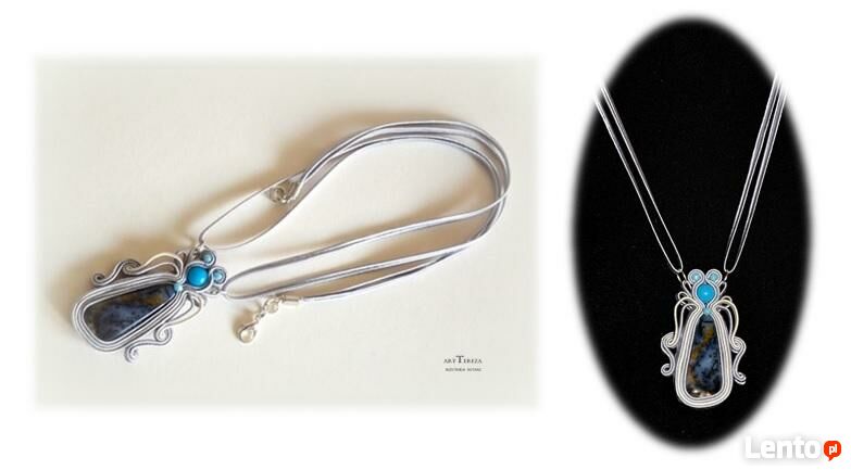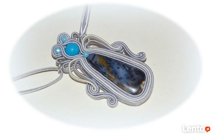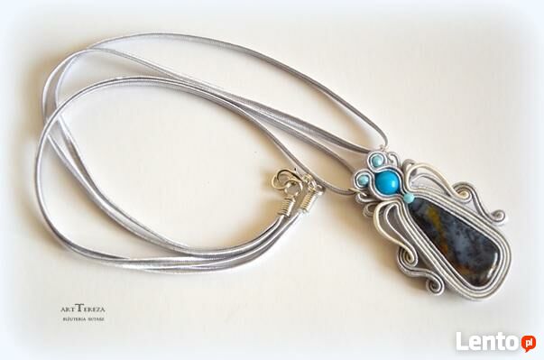 Kunsztowne ręczne wykonanie. Wisiorek zdobi piękny okaz agatu dendrytowego z Kazachstanu o naturalnym niepowtarzalnym wybarwieniu w kolorach. Wartość kamienia jest uzależniona od posiadanych wybarwień. Kamień dendrytowy charakteryzuje się tym że wewnątrz posiada również czarne wrostki przypominające drzewa lub paprocie, /widoczne na zdjęciu/. To ciekawy i piękny kamień oprawiony w sutasz. Dodatkowo w górnej części wisiorka został wstawiony naturalny jadeit górski w kolorze błękitu. Spód wykończony skórą eko. Wisior zaimpregnowany, ochrona przed zabrudzeniem i wilgocią. Piękny oryginalny gotowy prezent, z całego serca polecam.teresa