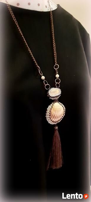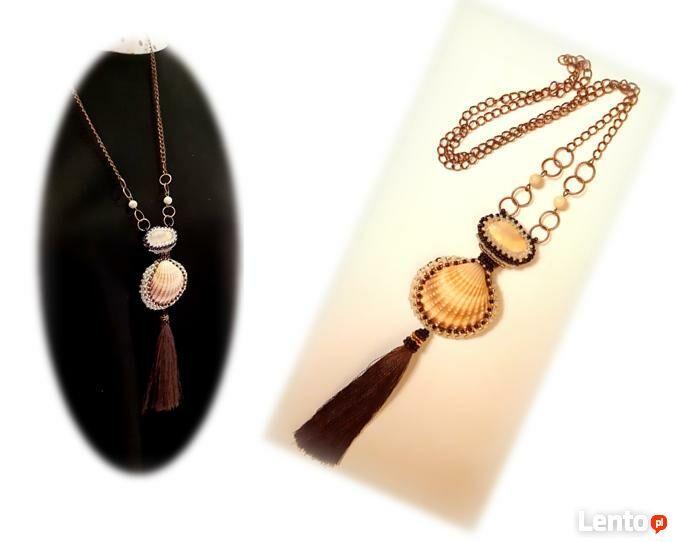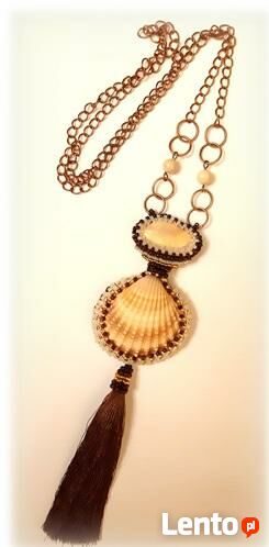Wisior zawieszony na łańcuszku w kolorze miedzi w którym zostały umiejscowione dwie kulki z naturalnego marmuru. Centralnie dwie naturalne muszle, które zostały oprawione drobnymi szklanymi koralikami renomowanej firmy japońskie TOHO , dodatkowo ozdobiony chwostem /hit 2019/. Wisior rewelacyjnie się prezentuje. Spód wykończony skórą eko. Dla kobiet które uwielbiają długie zwisające wisiory. Można obdarować kobietę np. z okazji imienin, urodzin, rocznicy. Super prezent np. pod choinkę czy dla mamy,babci,cioci, przyjaciółki itp. Będzie pasować do sukni czy bluzki w jednolitym kolorze. Polecamteresa